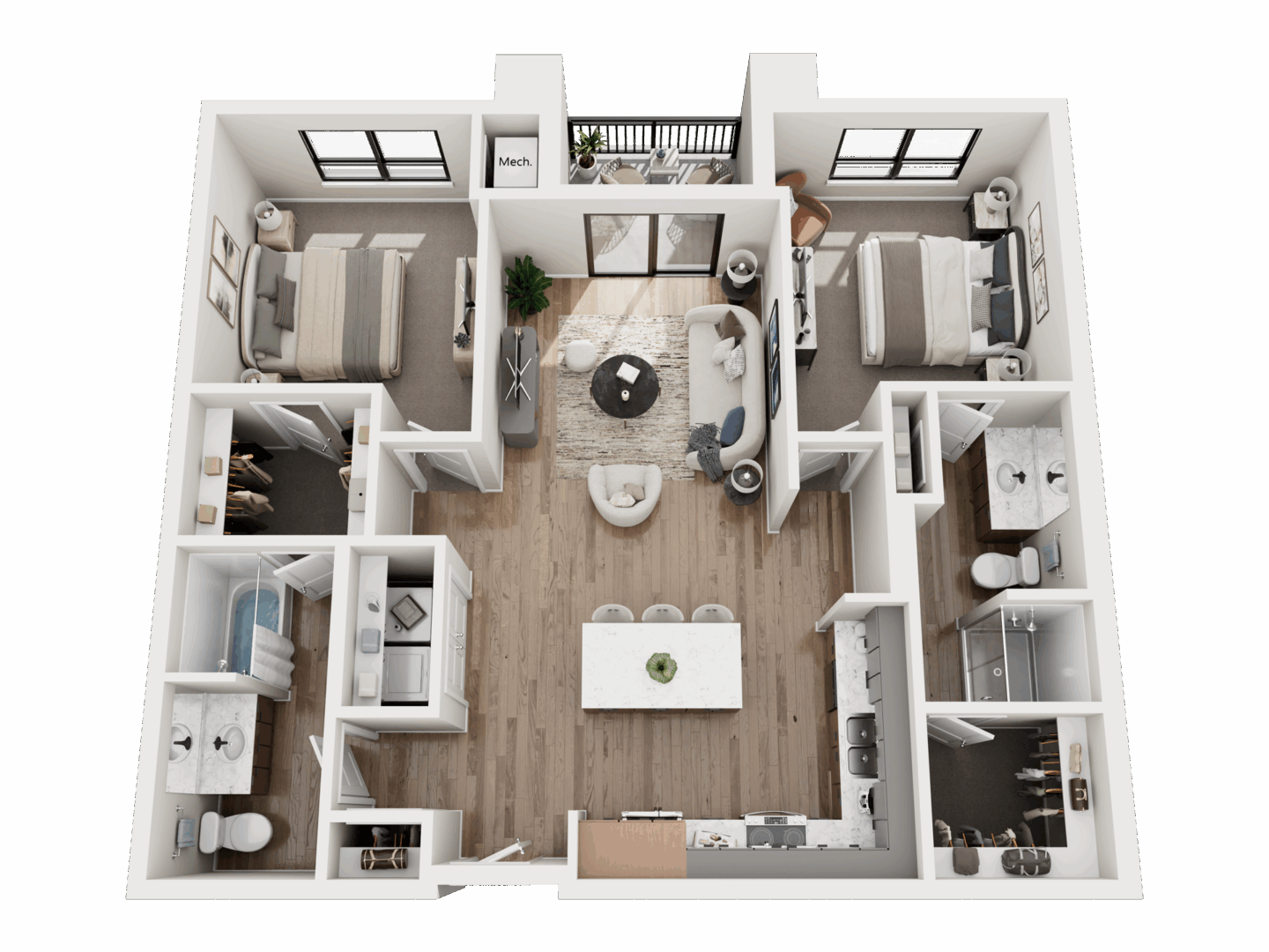 Our Two-Bedroom, Two-Bathroom apartment homes showcase open-concept layouts, expansive walk-in closets, elegant granite countertops, premium stainless steel appliances, in-unit washer and dryer, secure underground parking, and additional storage.